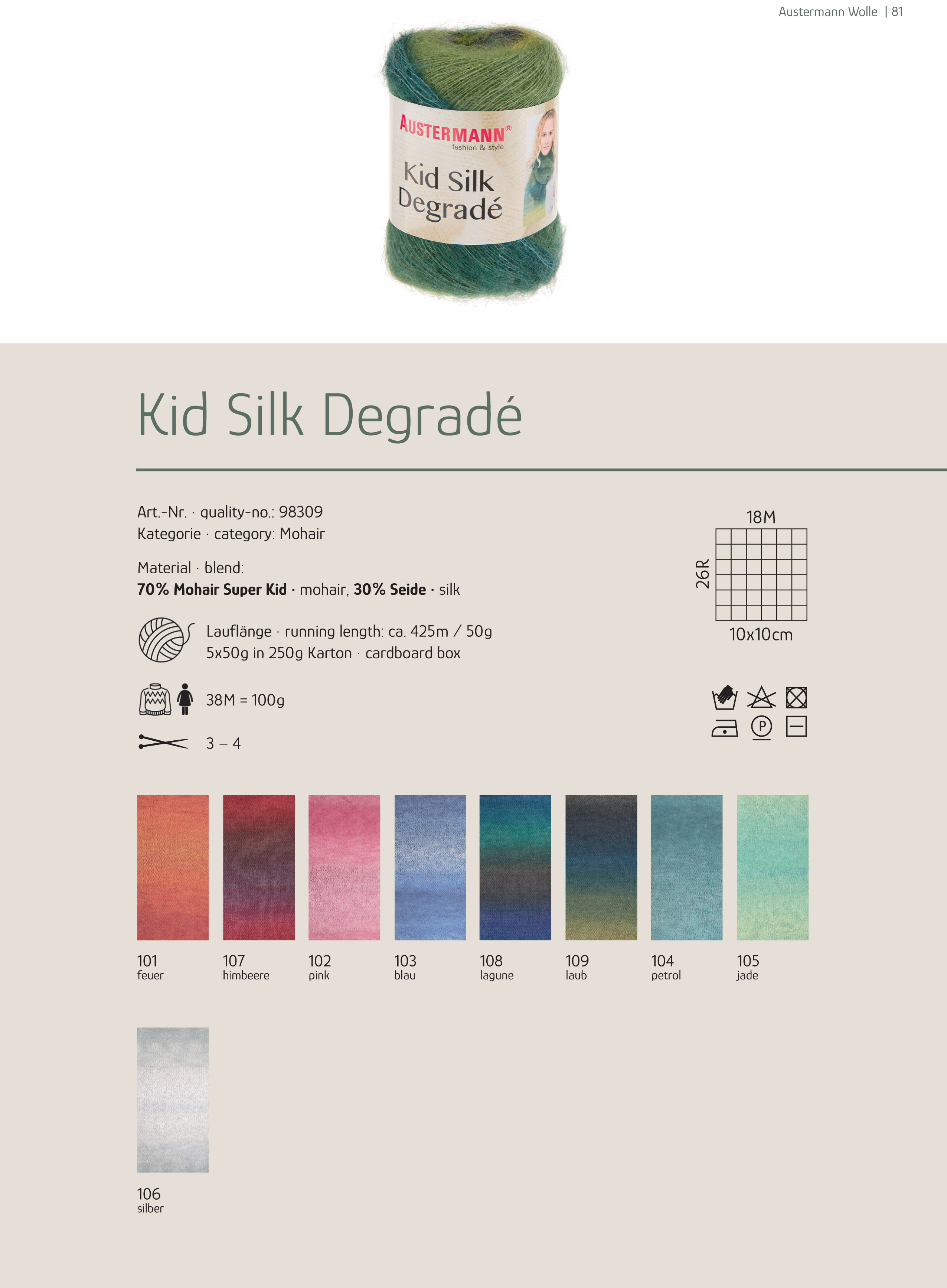 Zusammensetzung: | 70% Mohair Super Kid, 30% Seide |